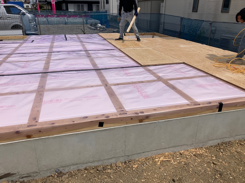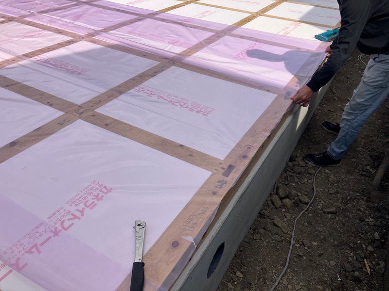 まず床の断熱材の上に気密シートを施工します